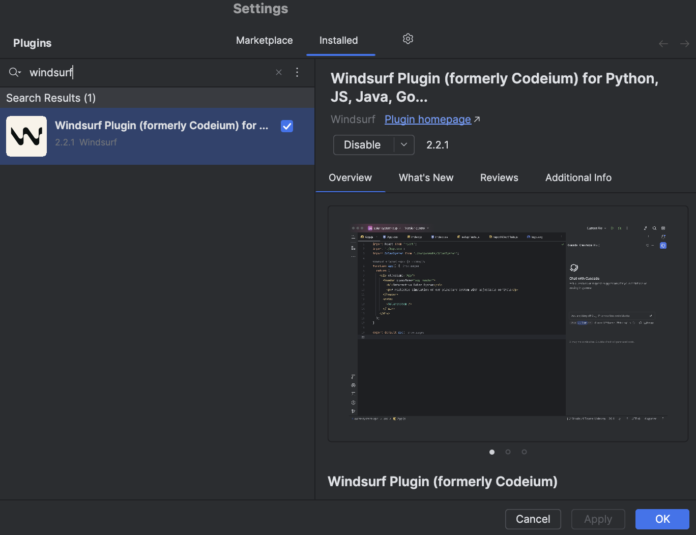 Search for the Windsurf plugin, and install it. The plugin loader will prompt you to restart the IDE.
