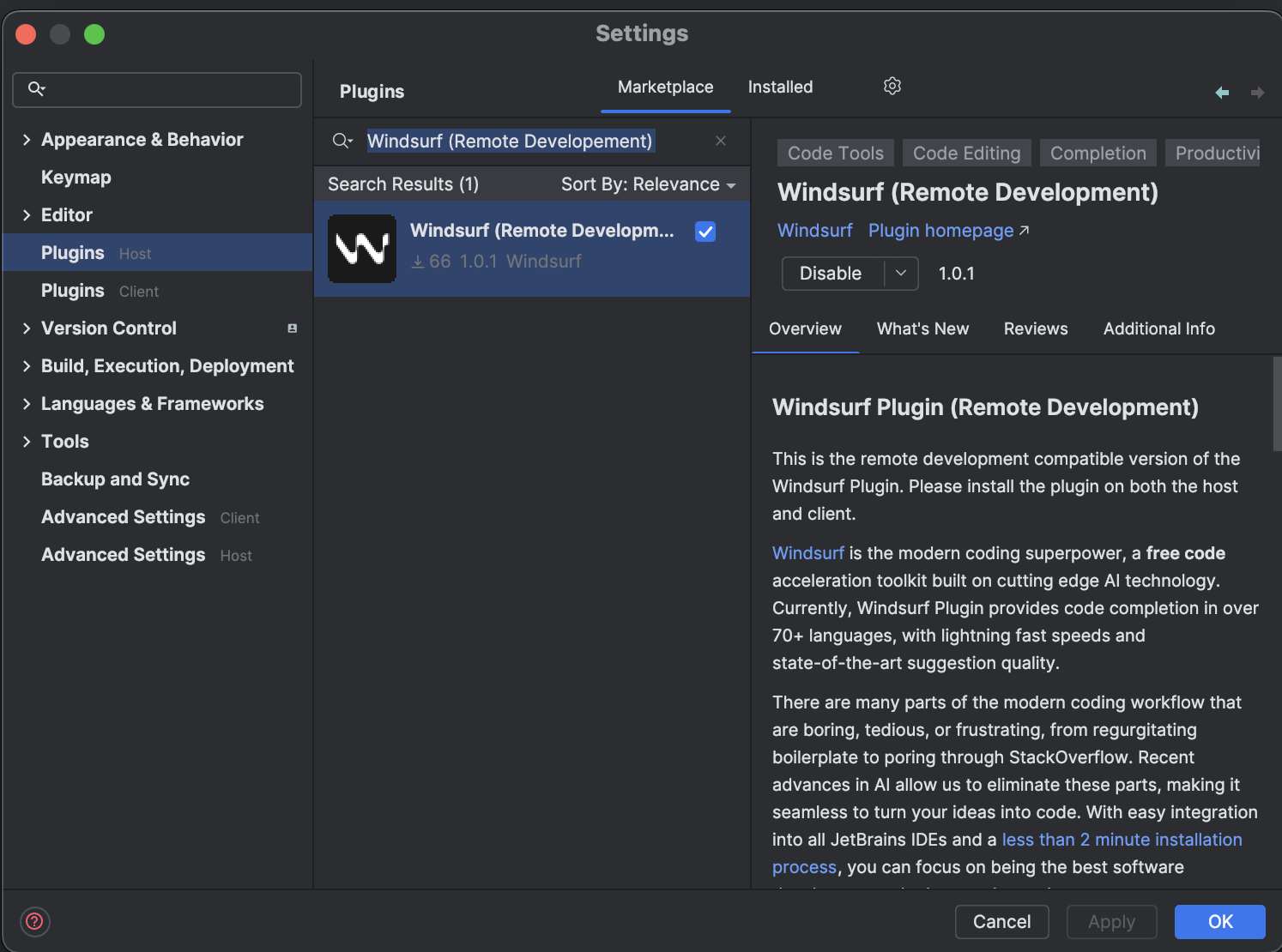For JetBrains IDEs used in remote development environments, you need to use the separate “Windsurf (Remote Development)” plugin.Requirements