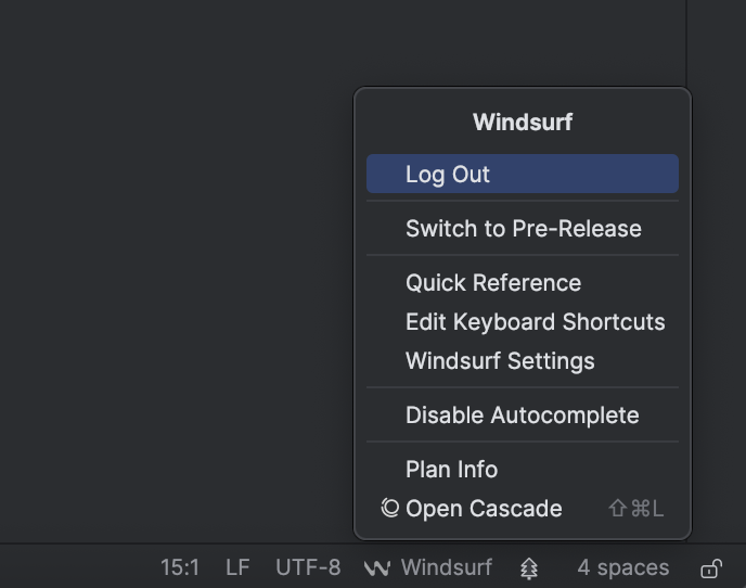 You can now enjoy Windsurf’s rich AI featureset: Autocomplete, Chat, Command, and more.At any point, you can check your status by clicking the status bar widget at the bottom right.