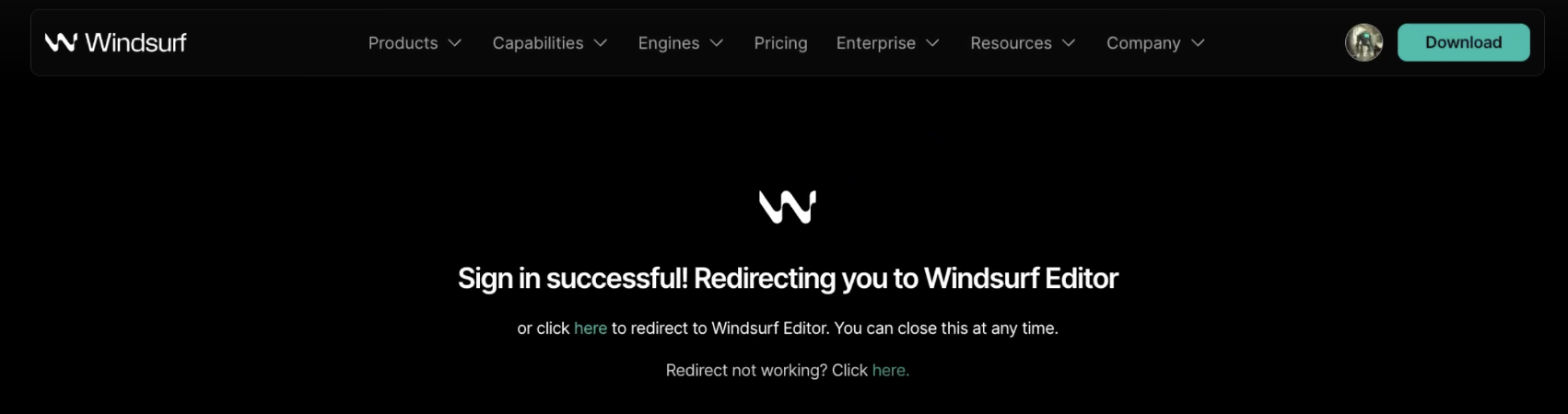 After the language server download is completed, Windsurf should prompt you to log in with a notification popup at the bottom right linking you to an online login page.