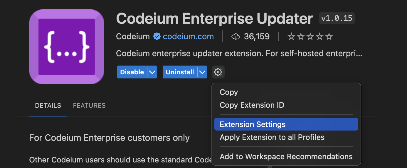 - Navigate to the Codeium Enterprise extension settings by pressing Ctrl+Shift+X. Choose the Enterprise Updater (purple extension)
