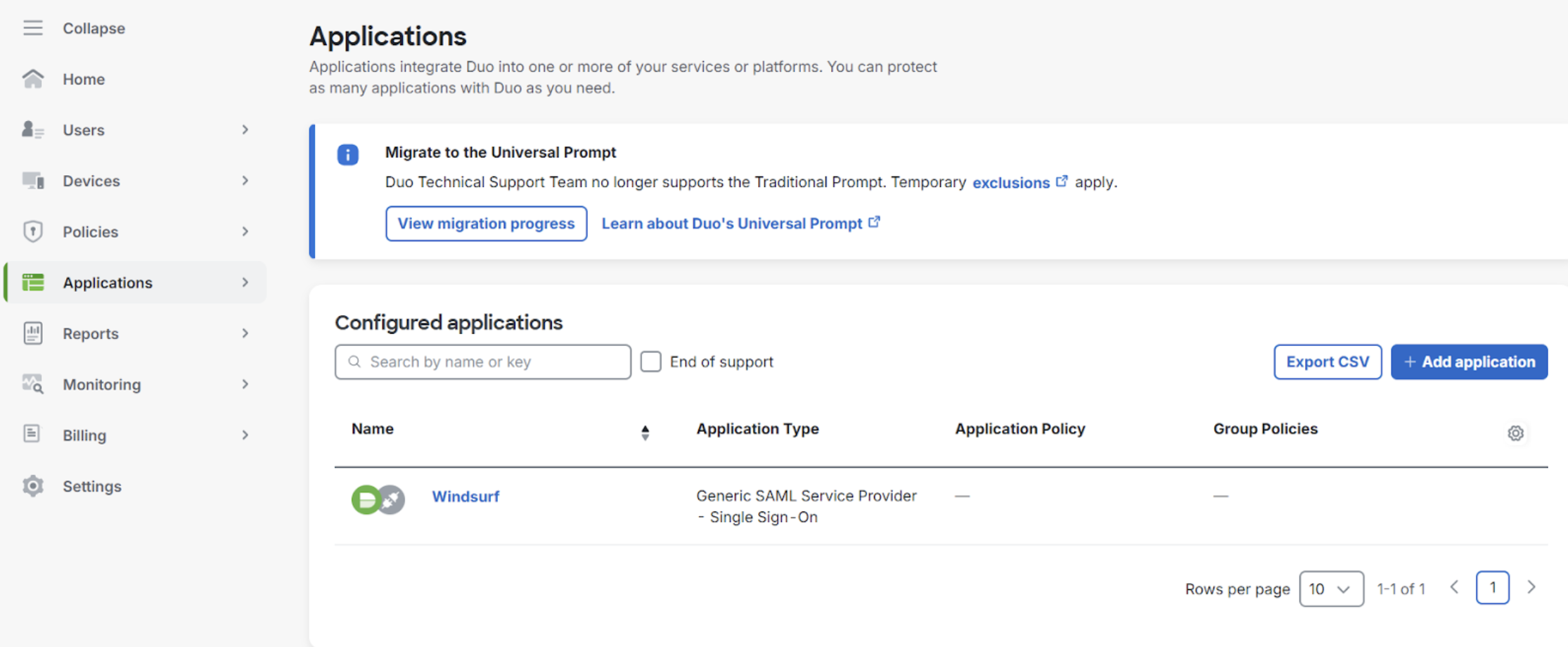 This guide assumes that you have Duo configured and acts as your organizational IDP, or has external IDP configured.You will need administrator access to both Duo and Windsurf accounts.Configure Duo for Windsurf