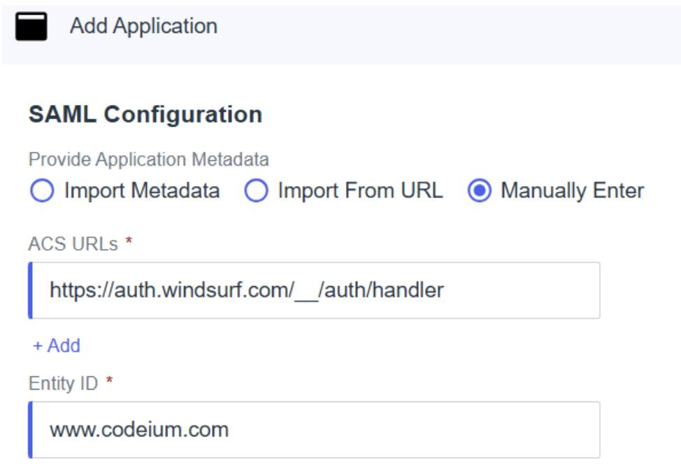 - Identifier (Entity ID): Copy the SP Entity ID value from the Windsurf SSO settings page