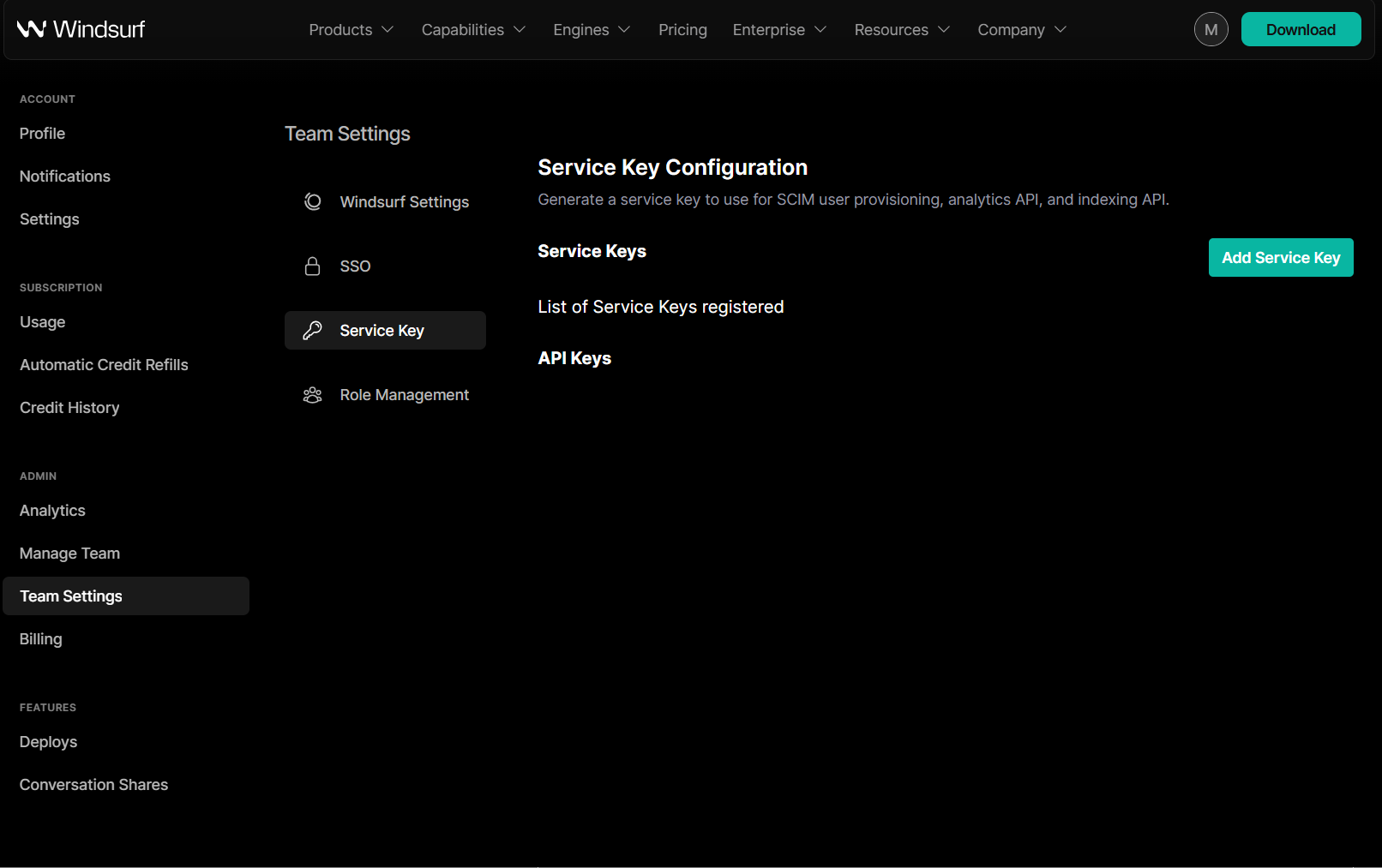 Go to https://windsurf.com/team/settings. Under Service Key Configuration, click on Add Service Key. Enter any key name (such as ‘Azure Provisioning Key’) and click Create Service Key. Copy the output key and save it, you can now use the key to authorize the above APIs.Prerequisites