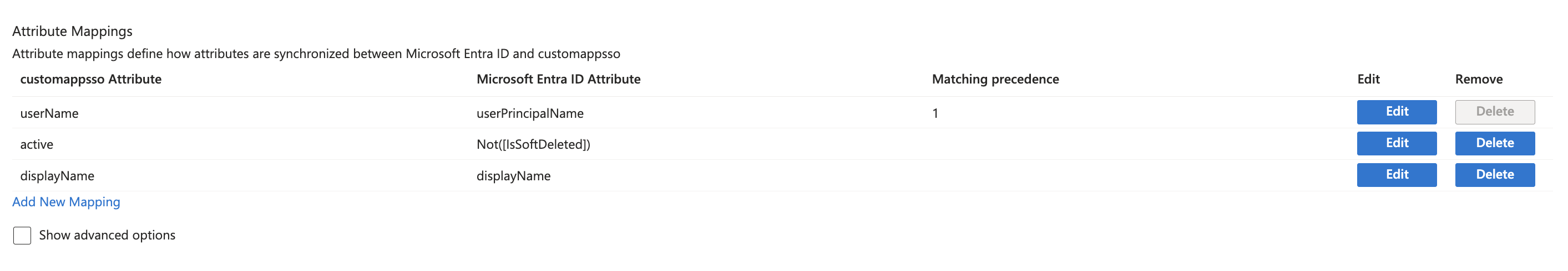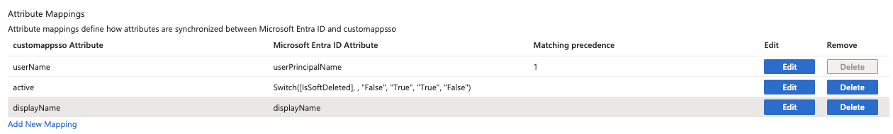 Under attribute Mappings, delete all fields under displayName, leaving only the fields userName, active, and displayName.