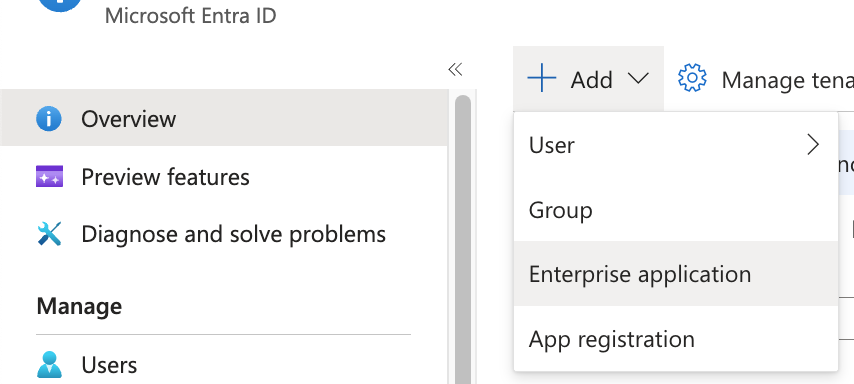 - In Microsoft Entra ID, click on Add, and then Enterprise Application.