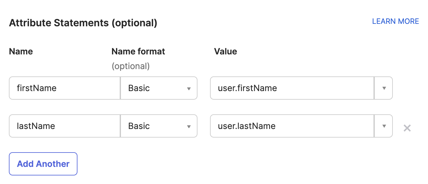 saml_subject- Email AddressfirstName- Given NamelastName- Family Name