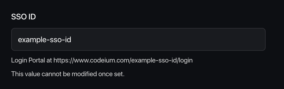 - When enabling SAML for the first time, you will be required to set up your SSO ID. You will not be able to change it later. It is advised to set this to your organization or team name with alphanumeric characters only.