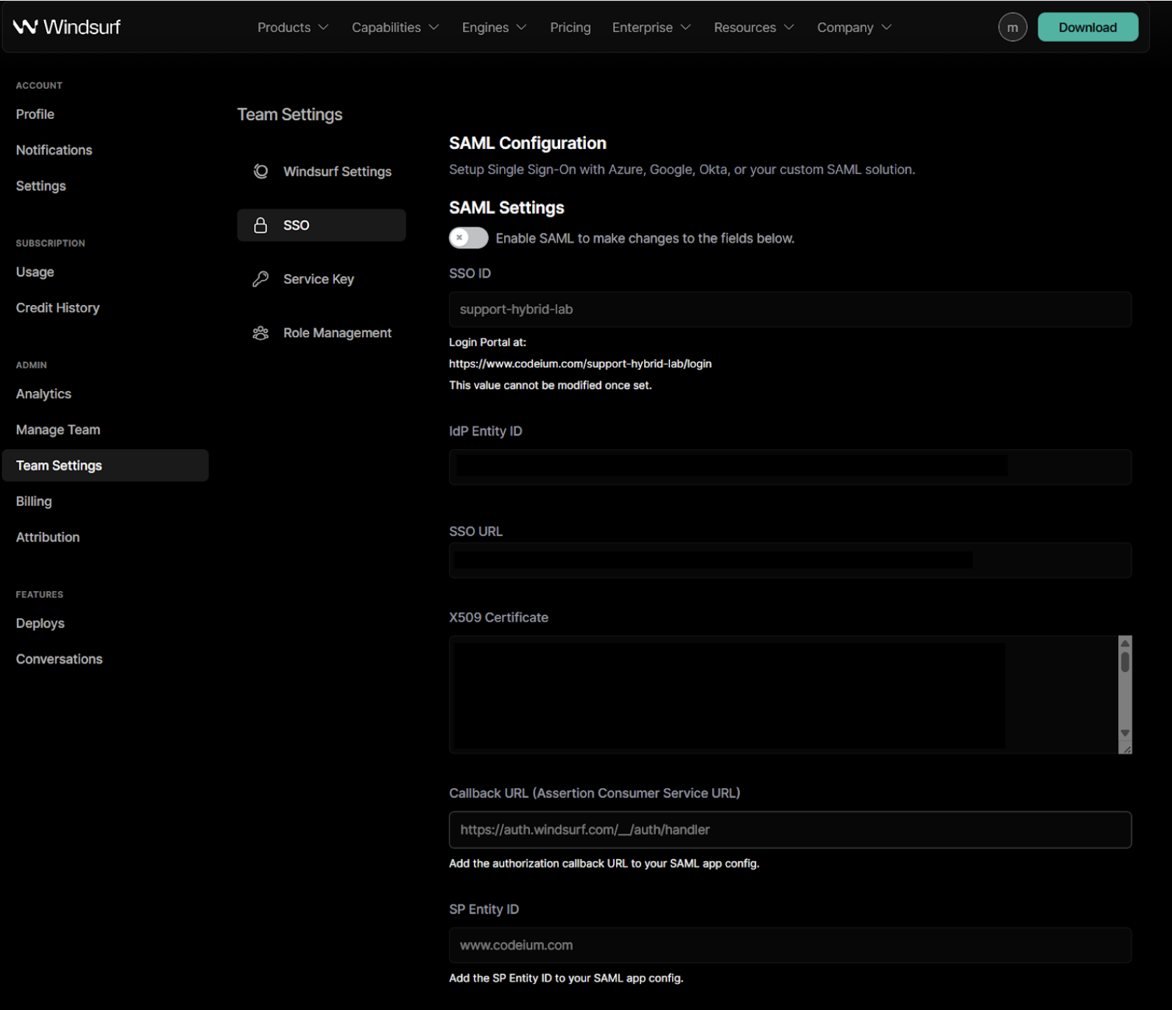 - Enable the SAML login in the Windsurf portal so you can test it.