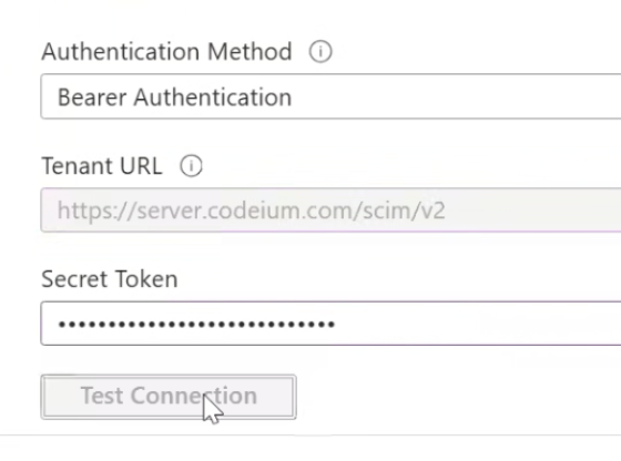 Under the Provisioning setup page, select the following options.Provisioning Mode: AutomaticAdmin Credentials > Tenant URL: https://server.codeium.com/scim/v2
