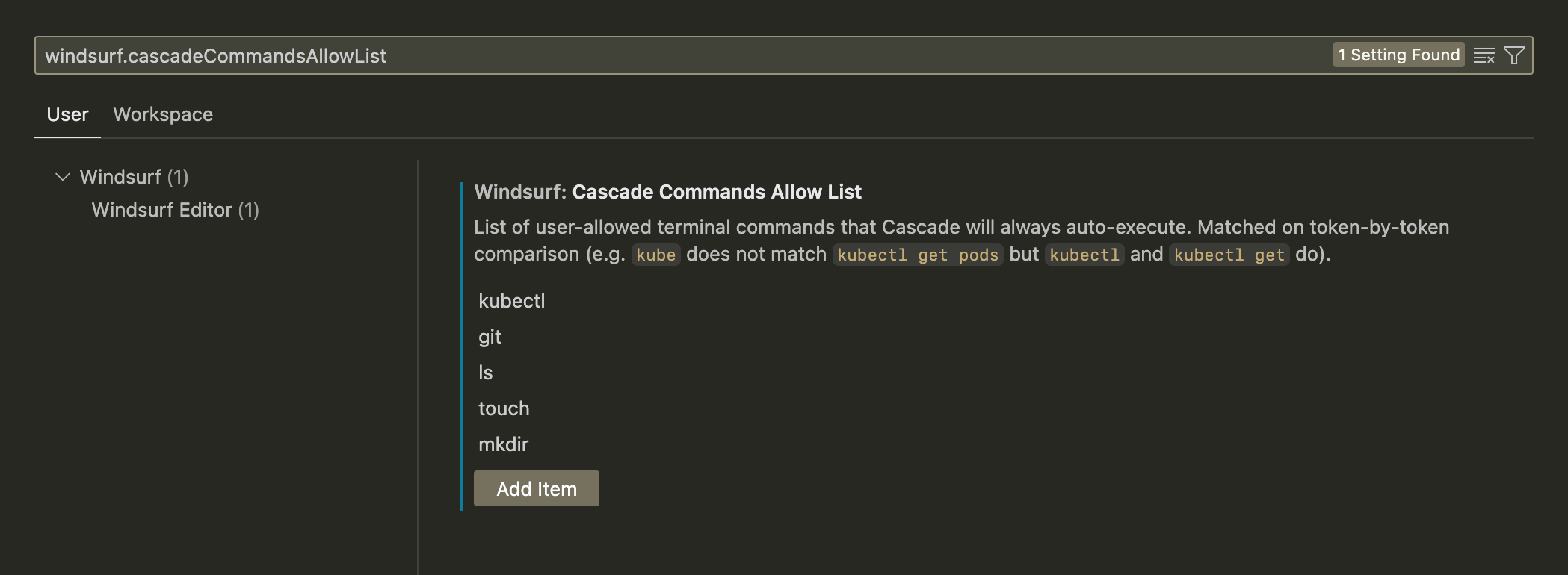 The setting can be via Command Palette → Open Settings (UI) → Search for windsurf.cascadeCommandsAllowList.